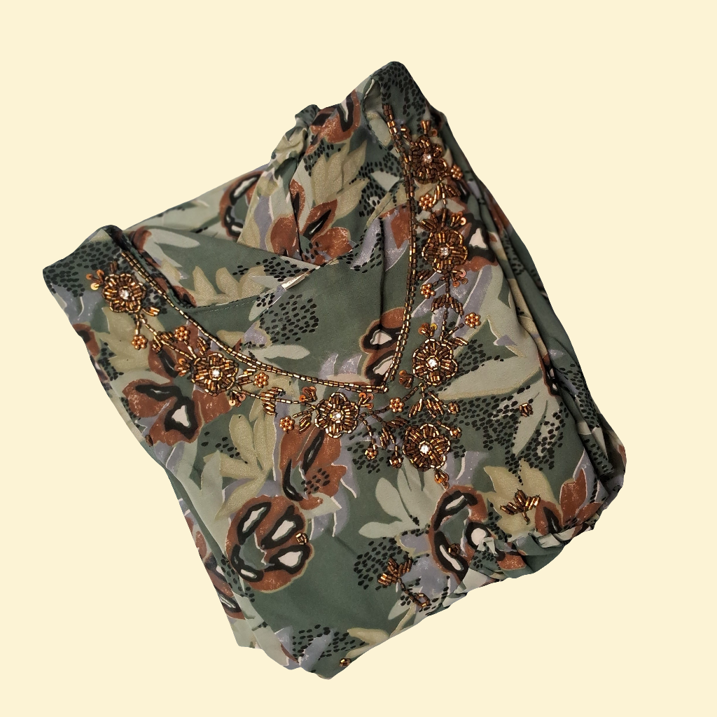 Floral printed Georgette A-line kurti with beautiful hand embroyidery on neck